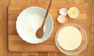 Poi unite le uova, il sale e la scorza di limone grattugiata. Quindi, lavorate il composto ancora per due o tre minuti. Ad operazione conclusa, in una ciotola capiente mescolate la farina con il lievito. Dunque aggiungeteci l'impasto realizzato nel mixer. A questo punto, lavorate il tutto fino ad ottenere una pasta liscia ed omogenea.
