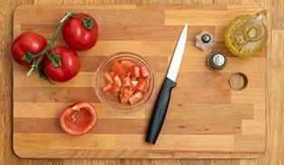 A questo punto dedicatevi a realizzare il condimento. Prendete i pomodori, lavateli e tagliateli a metà. Una volta tagliati, eliminatene la parte interna acquosa ed i semi. Ad operazione conclusa, tagliateli prima a listarelle e poi a cubetti. Dopodiché, conditeli con olio extravergine d'oliva e sale.