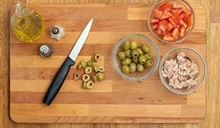 Quando avrete terminato con i pomodori, tagliate le olive a rondelle. Quindi sgocciolate il tonno e sbriciolatelo. Terminate la vostra pasta estiva condendo i fusilli con le Ciliegie di Mozzarella Santa Lucia, i pomodori a cubetti, le olive, il tonno, i capperi, il pepe, l'origano e un filo d'olio extravergine d'oliva.