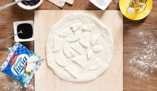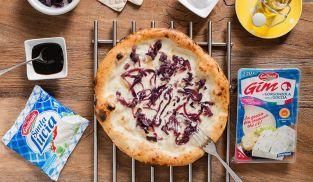 Pizza tonda con Gorgonzola Gim, Mozzarella Santa Lucia, cipolla caramellata e glassa al balsamico