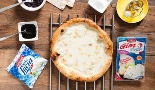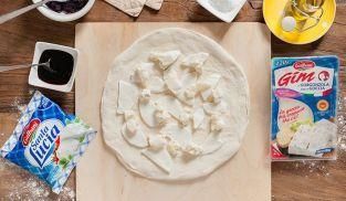 Aggiungete fiocchi di Gorgonzola Gim. Infornate sulla pietra refrattaria (o su una leccarda rovesciata) ben calda sistemata più in alto possibile nel forno. Cuocete la pizza per 3 - 4 minuti fino ad ottenere un colore dorato sul cornicione.