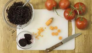 Nel frattempo fai cuocere il riso venere in acqua bollente leggermente salata e scolalo sotto acqua corrente tiepida.