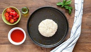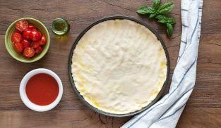 Aiutandovi con i polpastrelli unti d’olio, stendetelo schiacciandolo. Deve coprire tutta la superficie della teglia in modo uniforme. Dovete ottenere un disco di pasta di spessore ridotto che in cottura acquista un'ottima croccantezza.