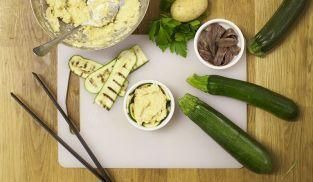 Prendi le zucchine grigliate e disponile a raggiera in un pirottino di ceramica monoporzione.