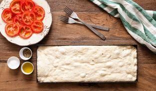 Stendete l’impasto sulla teglia unta di olio e allargatelo con i polpastrelli fino coprire tutta la teglia uniformemente. Ungete la superficie con poco olio extravergine e lasciate lievitare in luogo caldo per circa 1 ora. Infornate in forno caldo a 230°C: la teglia va posizionata sulla griglia riposta sul fondo del forno. Fate cuocere per circa 15 minuti.