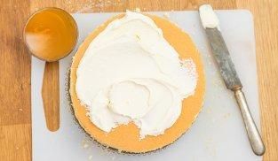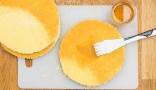Prendete i dischi di pan di spagna e bagnateli con il liquore o con il succo di mela. Prendete il primo disco e spalmatevi la crema al mascarpone e miele preparata in precedenza.