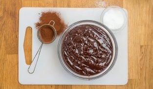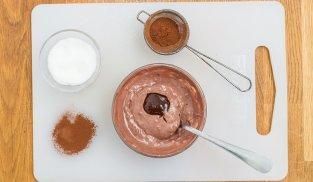 Per la base di cioccolato:Montate i tuorli con circa 50g di zucchero a velo. A parte montate gli albumi con il restante zucchero. Unite tuorli e albumi e aggiungete cacao e fecola.