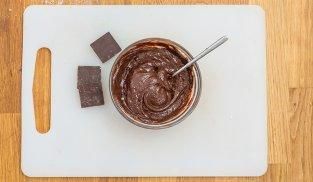 Preparate ora la mousse al cioccolato: mettete in ammollo la gelatina in acqua fredda, strizzatela e fatela sciogliere in un goccio di panna tiepida.