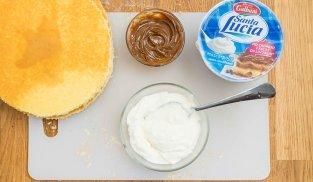 Ponetevi sopra il secondo disco e ripetete l’operazione, fino a terminare con l’ultimo disco di pan di spagna.