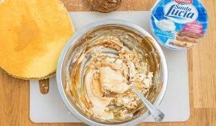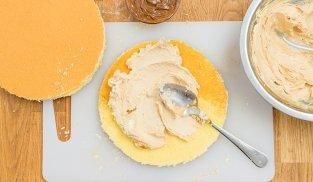 Prendete i dischi di pan di spagna e bagnateli con il liquore al caramello o con il succo di mela. Prendete il primo disco e spalmatevi la crema al mascarpone e dulche de leche preparata in precedenza.